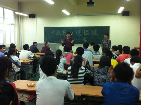 的一员,并代表学院与学校为新生送上节日的祝福;随后学院辅导员组长方有林以及新生辅导员王国栋老师相继发言以表对同学们的慰问与亲切关怀。现场的每位同学都收到了工作者送来的被赋予爱与关怀的温暖月饼,水果及糖果瓜子等,营造出一种浓厚的家的氛围。现场进行了多种有趣游戏,如指手画脚猜成语,传数字等,将现场氛围推向一个又一个高潮。贫困生代表也上台进行即兴演奏,高歌《朋友》,《明月几时有》等,活动在一片掌声中落幕。