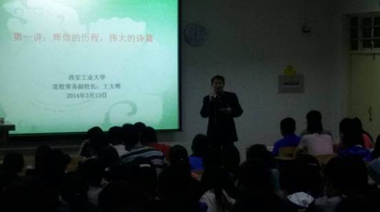 王老师以“辉煌的历史,伟大的诗篇”为主题结合中国共产党九十三年来的发展历史集中为大家讲述了马克思主义的实践性、开放性,中国特色社会主义理论和党在党内建设方面的先进行以及中国共产党在挫折中不断反省,得到进步并最终建立政权的艰难过程。