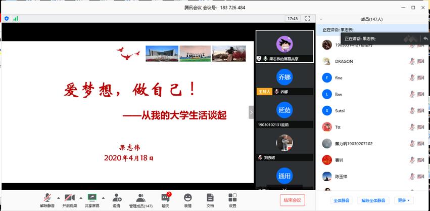 通过“腾讯会议”特别举办了“薪火相传西工魂 奋力追梦材化人”优秀校友云报告会,学院党委副书记张艳霞、副院长陈卫星、郭永春,各年级学生辅导员及180余名学生代表参加了此次云报告会。本次校友云报告会由2009级校友果志伟、2012级校友王学东、2013级校友郝运和2014级校友姚智豪主讲,2019级学生辅导员乔娜主持。
