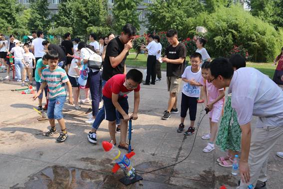 学生第二党支部毕业党员担任火箭手,通过前期对火箭手多次的培训、组装、训练和测试,党员能够为附小学生和家长给予专业指导和普及。附小学生专心学习并积极参与到活动中,一个个水火箭在附小学生和家长的欢呼声中“嗖嗖”冲上天,经过多次发射练习使每个小火箭手都练就成自己心中的“专业火箭手”。
