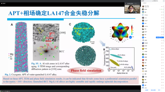报告中,赵宏宇教授指出了集成计算材料工程在材料设计、材料加工过程控制和优化方面显示出越来越重要的作用,介绍了近期一个多尺度计算辅助设计高性能镁合金的案例:集成连续相场模型(调幅取向判断、调幅波长演变、调幅分解形貌)、第一原理计算(弹性各向异性、失稳区域、热力学稳定性判断)和位错动力学计算辅助实验设计,制备了新型调幅分解强化的、超高比强度Mg-14Li-7Al(wt.%)合金;然后介绍了基于经典热力学自由能模型的统一性,集成微观组织多级相场模拟(连续相场、晶体相场、微扩散相场)、宏观过程多场(流动场、温度场、缺陷)计算仿真以及铸件本体数据和工艺知识信息,跨尺度设计和优化合金结构件的液态成型工艺及案例。随后,向大家分享了关于面向工程应用的集成计算材料技术的思考和展望。