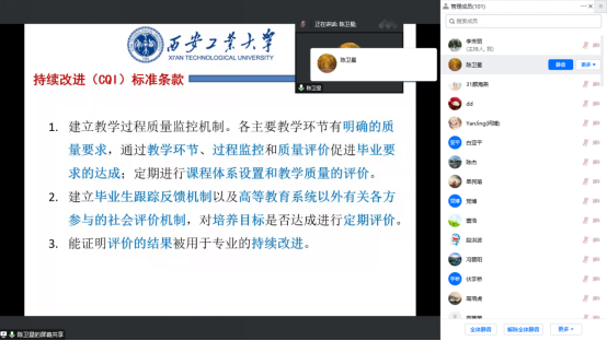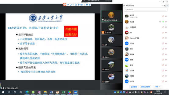 报告以做好全过程性考核评价持续改进工作为主题,分享交流了在工科教育背景下,持续改进的理念、全过程考核评价持续改进的必要性、持续改进关键点、持续改进标准条款、实施效果及存在的问题等相关内容。