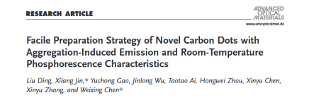 博士生丁镠在国际知名期刊《Advanced Optical Materials》(影响因子10.05)上发表研究论文 “Facile Preparation Strategy of Novel Carbon Dots with Aggregation-Induced Emission and Room-Temperature Phosphorescence Characteristics”。文章的第一作者为博士研究生丁镠,通讯作者为污污漫画