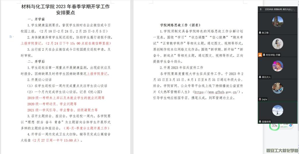 辅导员组长段强传达了学校关于春季学期学生教育管理工作文件的重要内容,并强调各年级辅导员要充分认识学生返校工作的重要性,密切关注学生动态,对返校学生健康检测、身体异常、延迟返校等学生数据进行全面排查和掌握,做好各项应对方案,扎实有效地开展好各项工作。