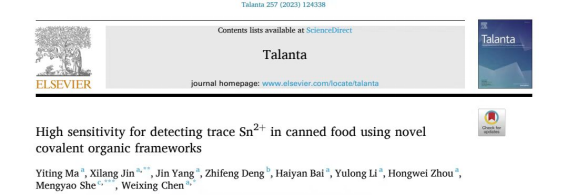 2020级硕士研究生马怡婷在《Talanta》(中科院分区化学类1区,TOP期刊)上发表题为“High sensitivity for detection of trace Sn2+ in canned food using novel covalent organic frameworks”的研究论文。该期刊是化学领域国际著名期刊,也是TOP期刊。文章的第一单位是污污漫画