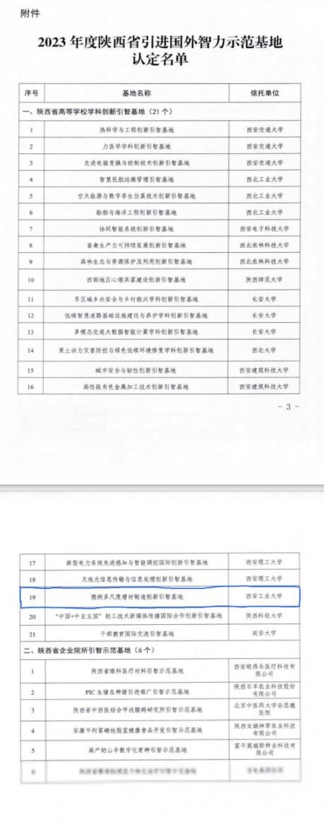 申报的“微纳多尺度增材制造创新引智基地”成功入选陕西省引进国外智力示范基地。此基地的成功获批是我校省级引才引智平台上的重大突破。