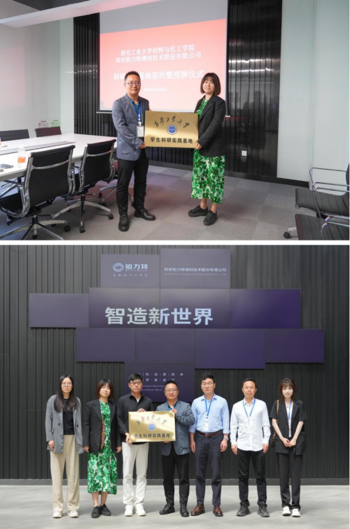 副院长杨巍、金属材料工程专业主任刘永勤,副主任周颖惠和任永明老师前往西安铂力特增材技术股份有限公司(简称“铂力特“)参加“科研实践基地”签约仪式。铂力特公司人力资源部总监杨利娜、技术研发部部长助理史超和人力资源部招聘专员贺梦娟出席签约仪式。