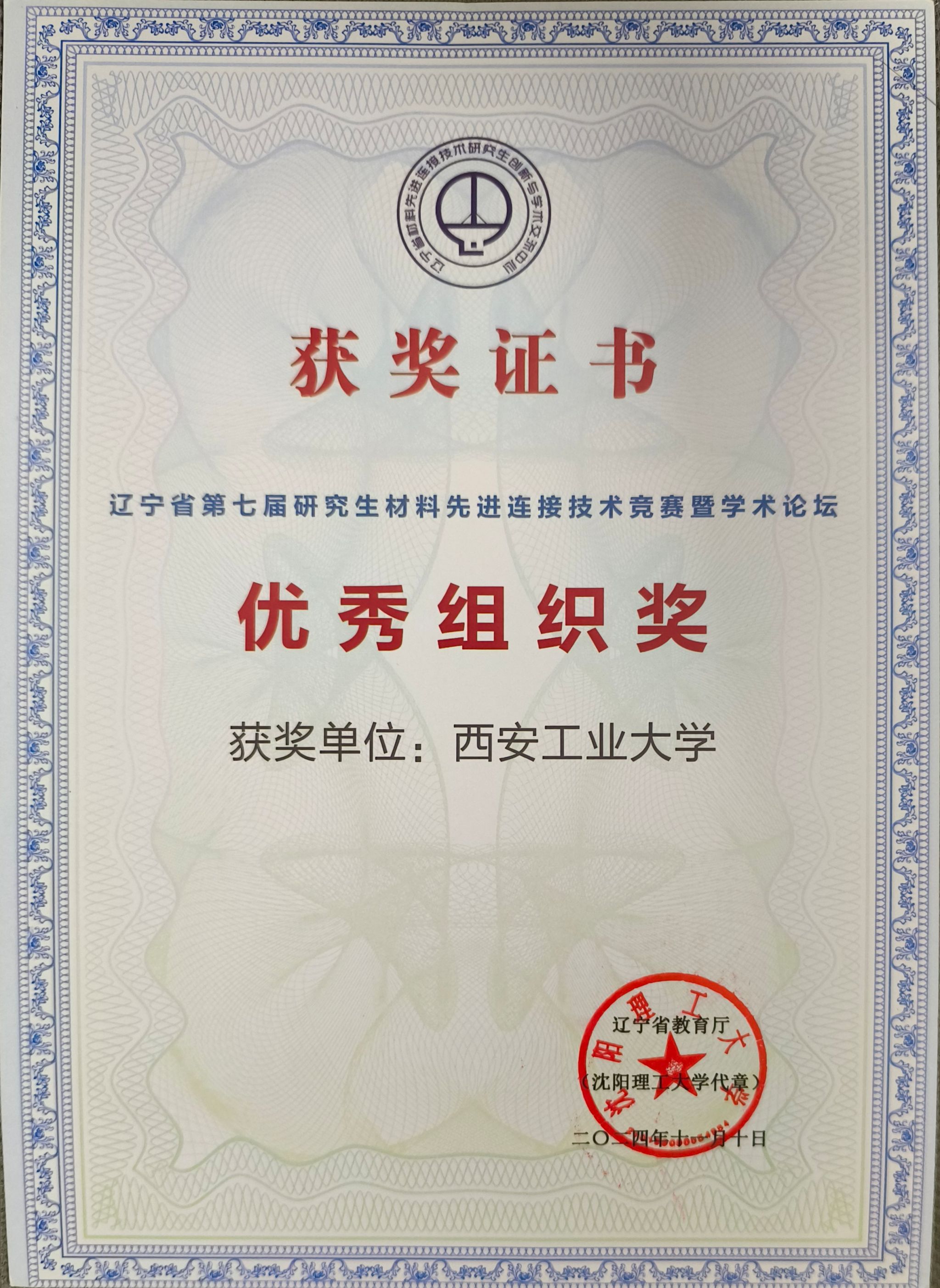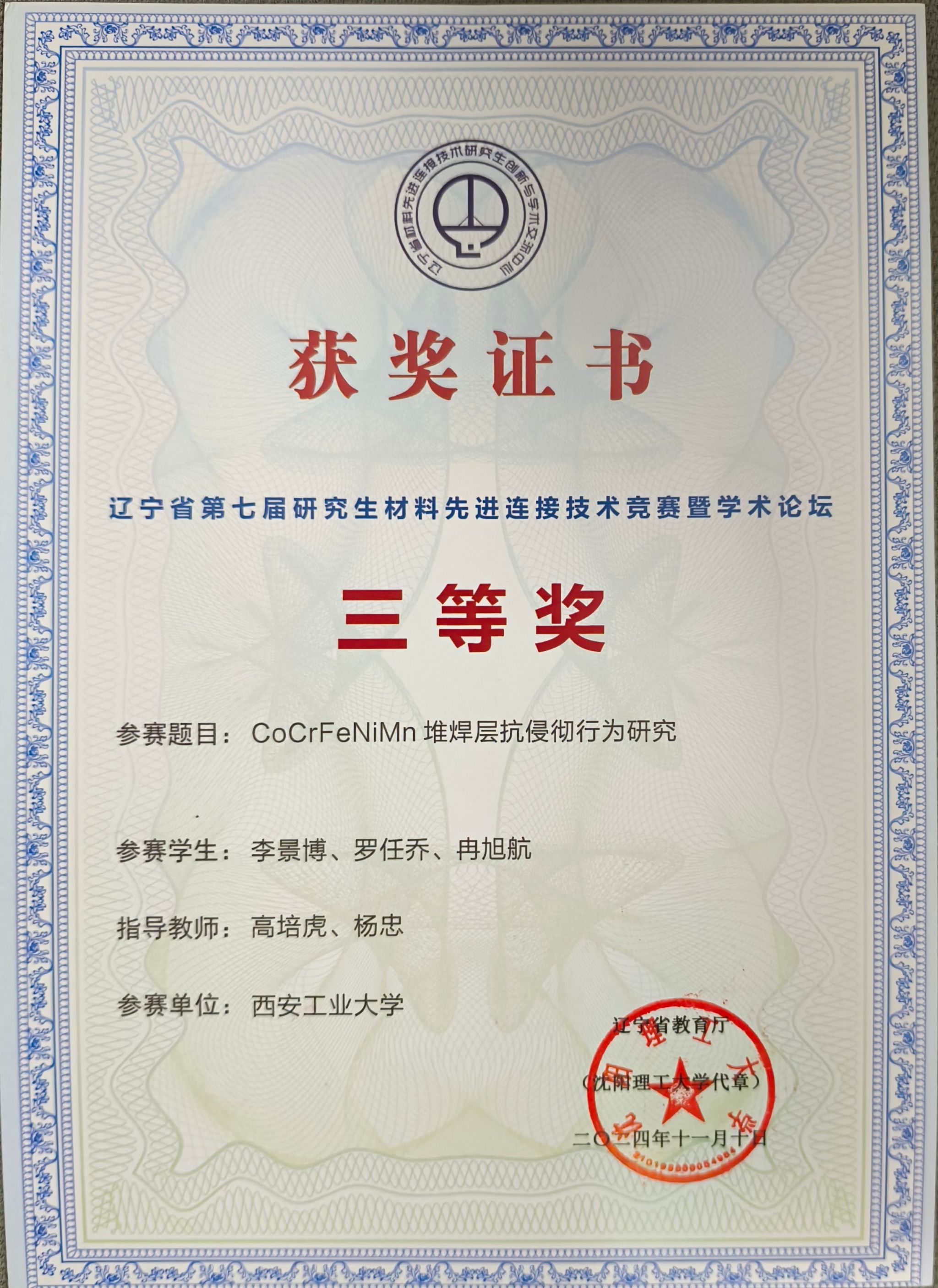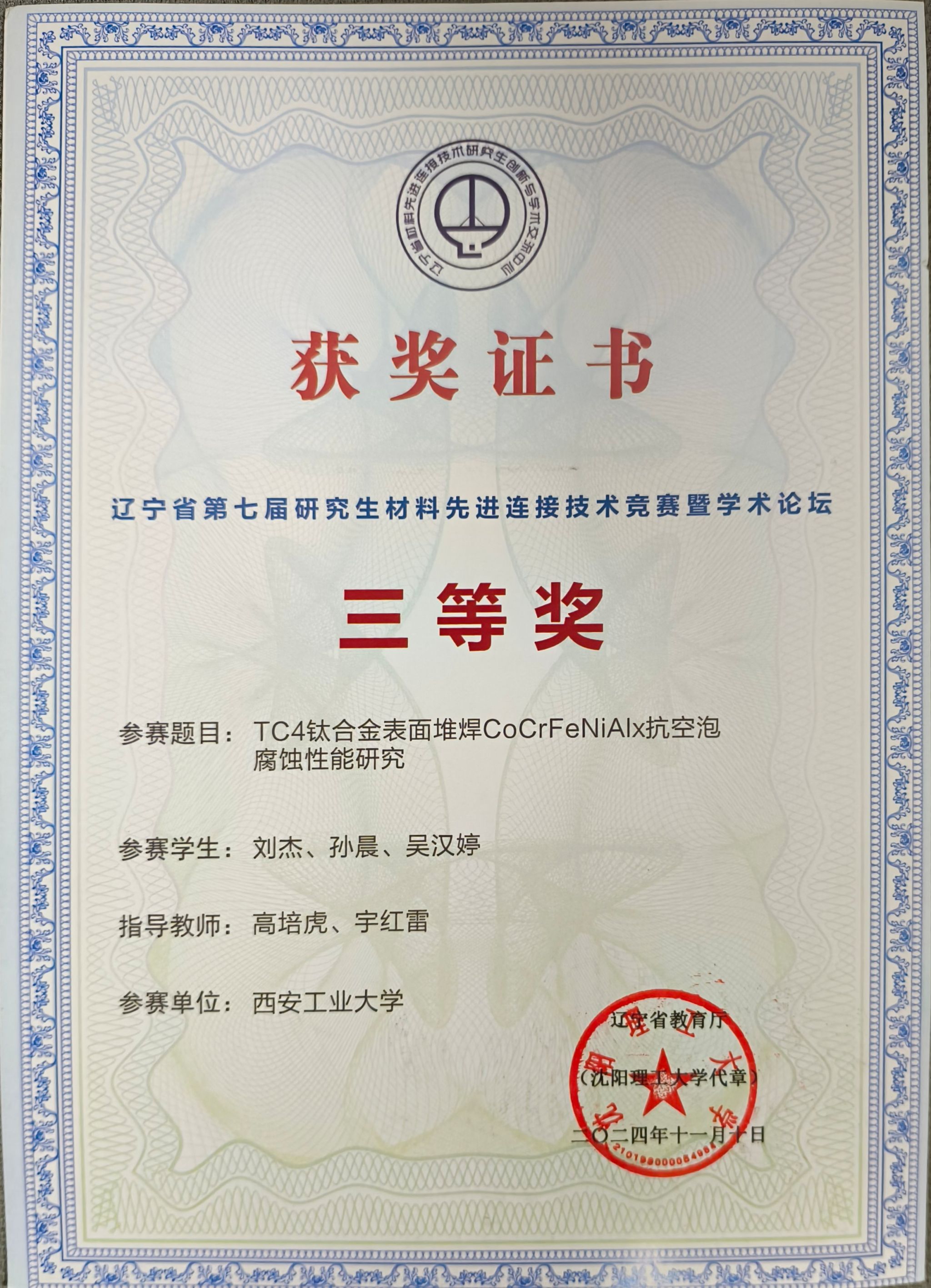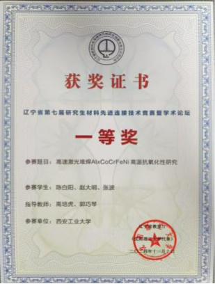 获优秀组织奖。其中由高培虎、郭巧琴指导,研究生陈白阳、赵大明、张波共同完成的作品《高速激光堆焊AlxCoCrFeNi高温抗氧化性研究》荣获一等奖,高培虎、杨忠指导,研究生李景博、罗任乔、冉旭航共同完成的作品《CoCrFeNiMn堆焊层抗侵彻行为研究》荣获三等奖,高培虎、宇红雷指导,研究生刘杰、孙晨、吴汉婷共同完成的作品《TC4钛合金表面堆焊CoCrFeNiAlx抗空泡腐蚀性能研究》荣获三等奖。