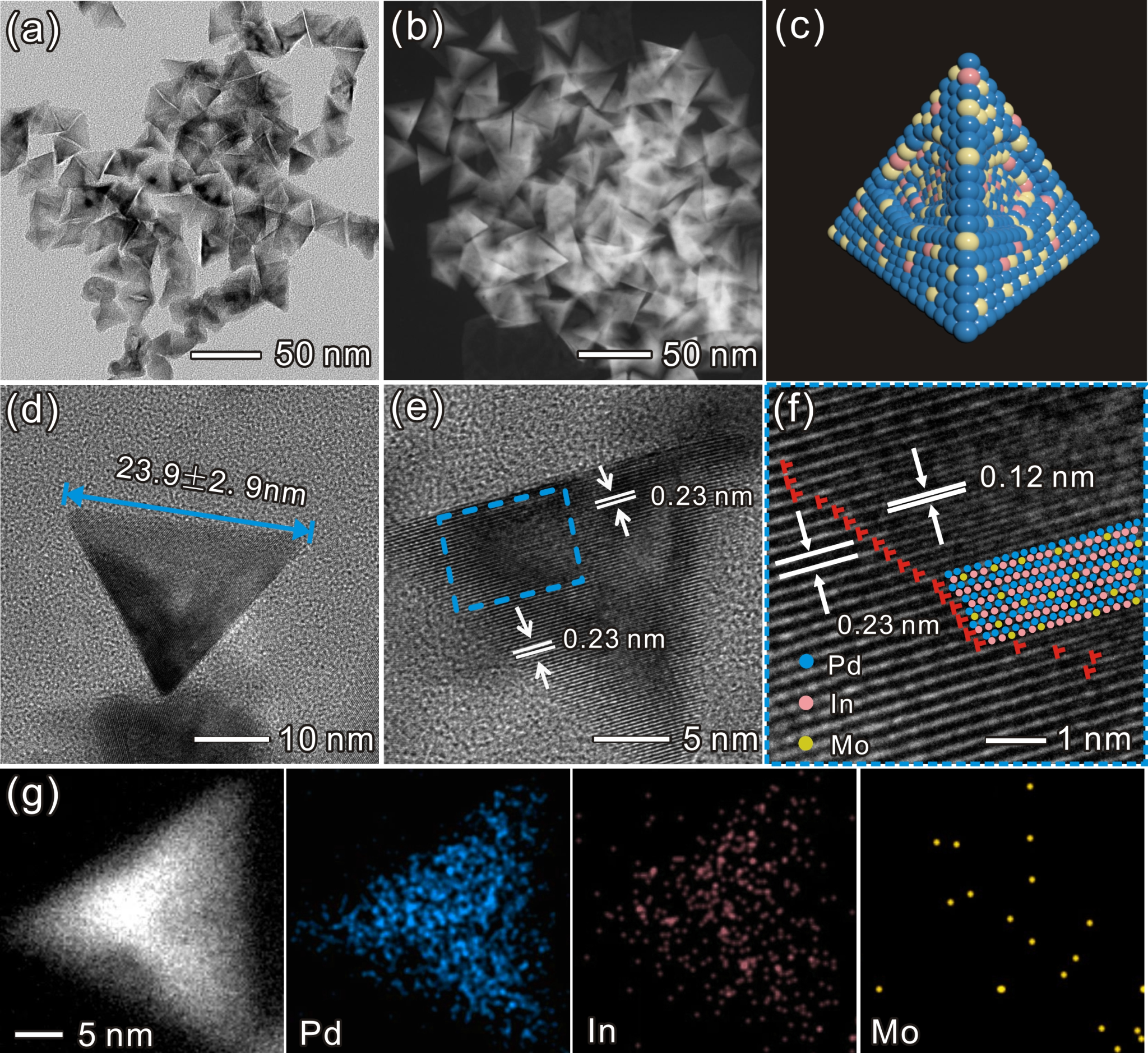 本研究采用简单的一锅反应法制备了凹面四面体结构的多相钯铟钼纳米催化剂。通过简单控制前驱体的浓度,获得了不同组成的多相四面体钯铟钼纳米催化剂。这些多相四面体钯铟钼纳米催化剂由面心立方结构和金属间结构组成。多相四面体钯铟钼纳米催化剂在小分子醇的电催化氧化方面表现出显著提升的性能。这些性能的增强主要来源于铟和钼原子的氧亲和性、内部多相结构的界面缺陷和金属间结构,在其共同作用下优化了醇分子在其表面的吸脱附能,提升转换效率。这种在钯基合金中构筑多相界面,从而优化催化效率的方式,为高效燃料电池催化剂的设计提供了一定的参考价值。