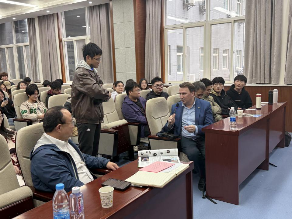 Pavel Kovalev Valyevich副教授在报告中系统介绍了俄罗斯圣彼得堡彼得大帝理工大学机械工程、材料与运输学院近年来的科研进展及国际科技合作动态,重点阐述了学院在先进材料研发、先进材料成形技术、结构设计、特种加工及计算模拟领域的显著成就,同时对新能源材料在交通运输工具中的应用研究进行了深入解读。他明确表示,愿以两校合作办学为契机,进一步深化双方科研协作,并推进研究生联合培养工作。在现场互动环节,同学们踊跃提问,围绕金属材料具体研究方向等问题与Pavel Kovalev Valyevich副教授展开深入交流,现场氛围热烈活跃。