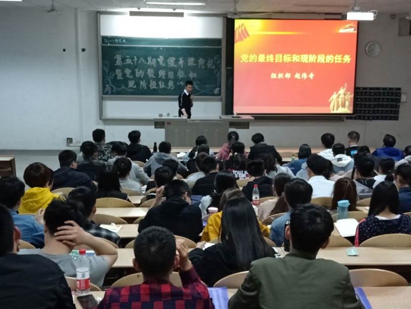 于教一-102开展第五十八期党课第一讲。本次培训的主题是党的最终目标和现阶段的任务,主讲人是校党委组织部赵伟奇老师。