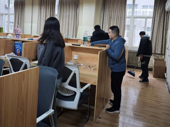 针对自习室存在的“桌面涂鸦痕迹”、“地面散落零食碎渣”及“座椅摆放无序”等问题,活动当日,志愿者们配备了清洁抹布、静电拖把等专业装备,对自习室展开了全面清扫,令其焕然一新。他们从一桌一椅的细微之处着手,让“党员红”的色彩成为自习室中最温馨的背景色。”
