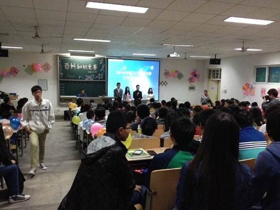 分团委书记王国栋老师为百科知识竞赛致辞。活动开始,选手们进行了激烈比拼;第二轮比赛结束后,各班亲友团献上精彩表演,活动达到高潮;比赛结果揭晓,各班均取得了不错的成绩,嘉宾为其颁奖,活动在亲友团的演唱中圆满结束。