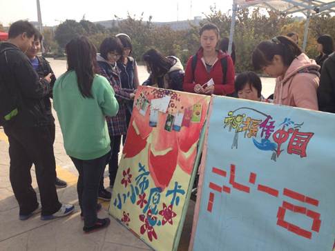此次活动主要分为“点梦”和“传递”两个部分,首先参加“点梦”活动的同学,他们需要在祝福接力棒上写上自己的姓名或者学号,然后将写好的祝福纸条贴在工作人员事先准备好的写有“祝福”两个大字草样的海报上,当祝福纸条贴满时,就会组成一个红色的“祝福”。参与第二个“传递”活动的同学,需要在我们事先准备好的明信片上写下自己心中小祝福或小愿望,然后将明信片留交现场的同时,可以带走其他同学写的祝福,并在自己力所能及的情况下帮助明信片的主人实现愿望。