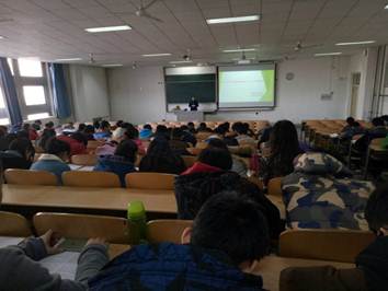 2014级辅导员张瑞红在教1-203组织2014级全体学生共同学习习近平在高校思想政治工作会议重要讲话。