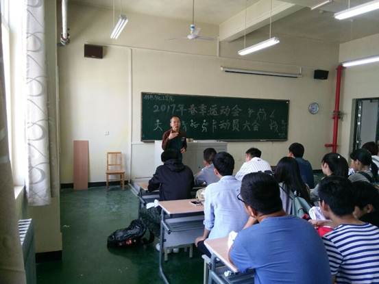 在往届运动会上的优秀成绩,希望所有参赛运动员能够全力以赴,赛出水平,继续为学院夺得荣誉。接着张老师又给所有运动员提了几个生活上的小建议,告诫运动员们从饮食、休息等多个方面来保持身体处于最好状态,叮嘱大家注意赛前热身、训练过程中注意安全,避免意外受伤,并预祝所有人都能在比赛中取得好成绩。随后段老师继续鼓励大家积极比赛,并介绍了本次运动会的表彰办法和后勤保障措施,确保运动员能得到最好的服务,专心比赛。至此本次动员会圆满结束。