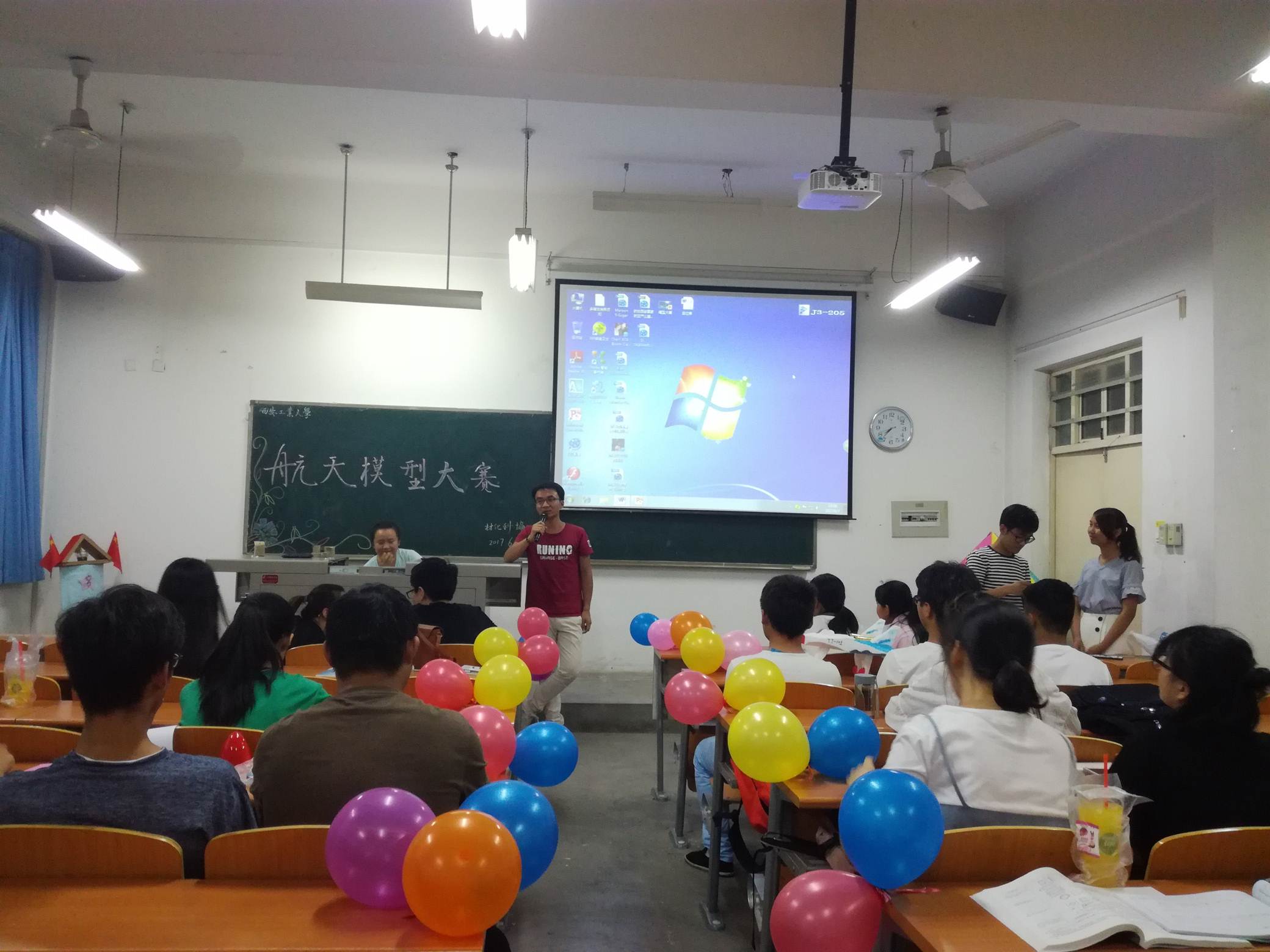 科协火箭节系列活动之航天模型制作比赛于教三205举行,科协主席张龙、李倩、邹文轩担任评委,参赛选手及科协全体成员到场。
