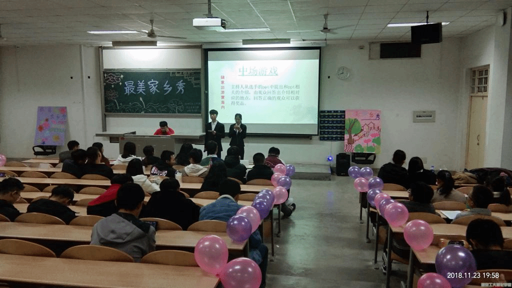 本次活动由周镇和郭小艳主持,活动主要是参赛选手以PPT的形式介绍各自家乡,在主持人的宣布下活动开始。首先,参赛选手依次上台讲解关于自己家乡的PPT,选手们生动的讲解诉说着每个人的思乡之情。伴着参赛选手的解说,各位评委 、嘉宾、观众犹如在扬州的雨巷中徘徊、在南阳与诸葛比智、在洛阳感受古都氛围。除精神上的满足外,让大家最兴奋的还是各地知名特产,仅仅图片也让人们大饱眼福。随后,进入中场抢答环节,观众们积极踊跃的与主持人互动、回答问题,把活动的氛围推到高潮。最终经评委评定和打分,朱秋雨同学以优越的成绩荣获本次活动的一等奖,罗茗洋同学荣获二等奖,武晗洁同学荣获三等奖。最后,由各位评委对本次“最美家乡秀”活动所有获奖选手进行颁奖。至此,本次活动圆满结束。