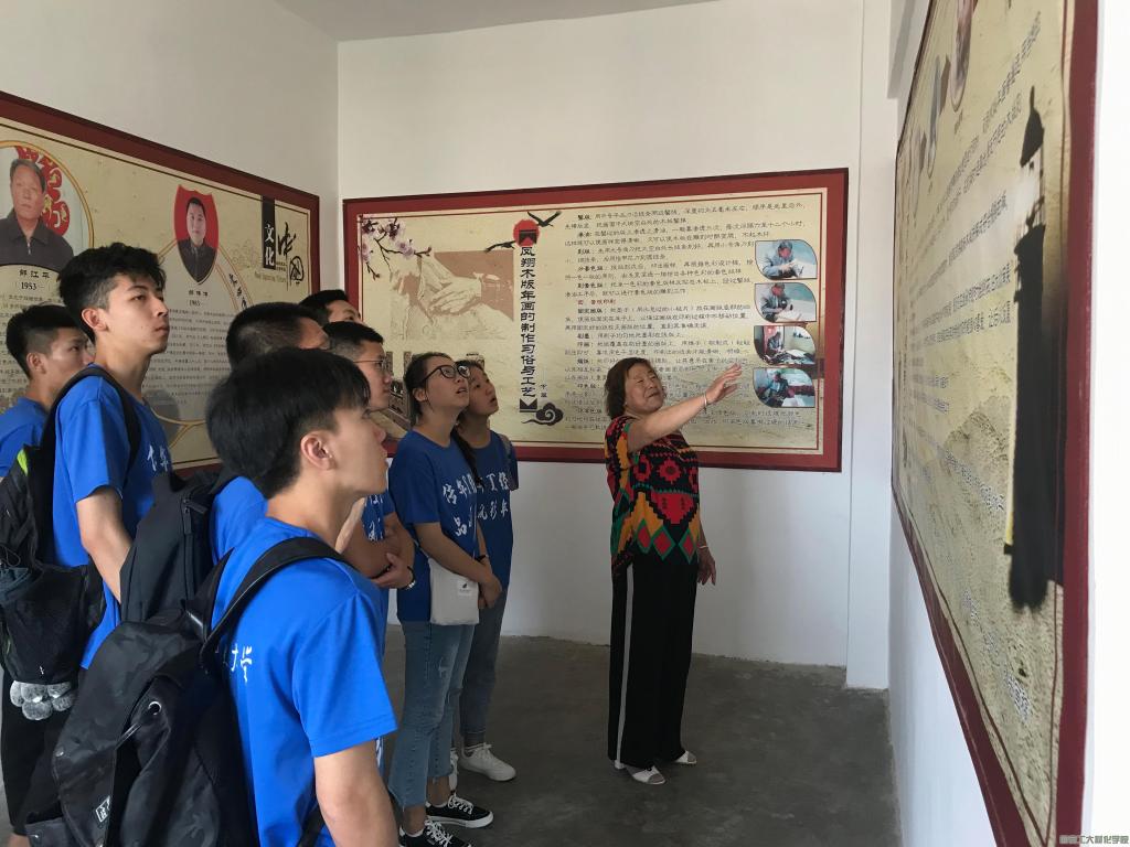 经过长达一个小时的颠簸路程,实践队于9点钟到达小李村。邰伟伟老师的母亲接待了实践队,表示很欢迎大家参观学习,交流心得。在她带领下,全队成员进入木版年画传习所,接着,在副队长蔡雨霏组织下队员们有序的参观木版年画展馆,了解到“祭灶王”,“门神”,“剪纸邮票型刻印”等不同类别年画。邰伟伟老师母亲通过选材拼版,起稿朽样,雕刻画版,套版印刷四部分为全队成员讲解木版年画历史,并对木版年画工艺制作流程,材料来源及木版年画中所含意义进行概述,提出木版年画中人物大多都以夸张的手法画出,加以谐音题目讽刺一些社会现实。随后,由邰伟伟老师带领全队成员对木版年画进行深入了解,剖析木版年画现状,并强调民间艺术的思维是发散的。最后邰伟伟老师对木板年画的销售渠道及销售方式进行说明。至此,这一天调研告一段落。