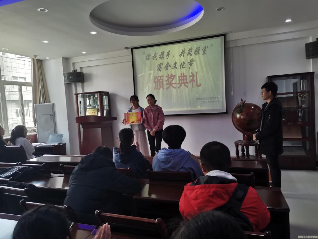 学生会干事赵禹主持,主持人宣布了本次宿舍文化节的获奖宿舍名次之后,分别由三位嘉宾为各获奖宿舍颁奖,并合影留念。颁奖仪式最后,由乔娜老师发表对此次宿舍文化节的看法,乔娜老师表扬了各宿舍的优点,指出了同学们生活中对宿舍文化建设的不足之处,并希望各位同学在以后的生活与学习中重视宿舍文化的建设,将宿舍打造成一个团结,和谐,学习氛围浓郁的大家庭。至此,本次宿舍文化节颁奖仪式圆满结束。