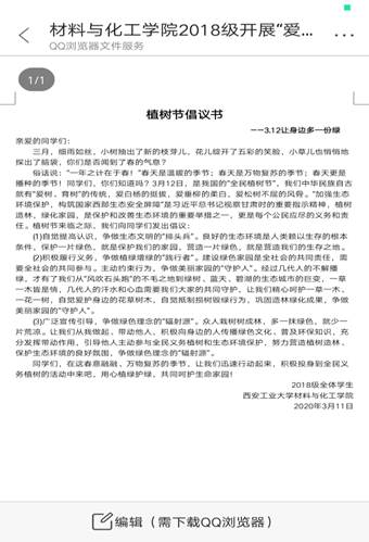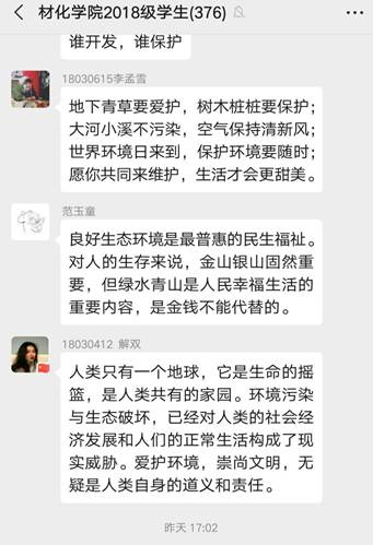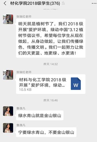 植树节来临之际,在2018级辅导员张瑞红老师组织下全体18级学生认真阅读了关于“爱护环境 绿动中国”植树节活动倡议书,并在年级群上积极发言。同学们纷纷表示:植树造林保护了我们赖以生存的环境,不仅可以绿化和美化家园,同时还可以起到扩大山林资源、防止水土流失、保护农田、调节气候、促进经济发展等作用,是一项利于当代、造福子孙的宏伟工程。“植”入绿色,“树”立希望,“造”福子孙,“林”荫后人。迎着和煦的春风,迈着轻快的脚步,让我们一起行动吧。活动最后由辅导员张瑞红老师进行总结她道:即使我们目前处于疫情期间但植树节传统不能忘,希望每位学生从现在做起,从身边做起,让我们传播绿色,传播文明。我们一起努力让我们的天更蓝、地更绿、水更清!