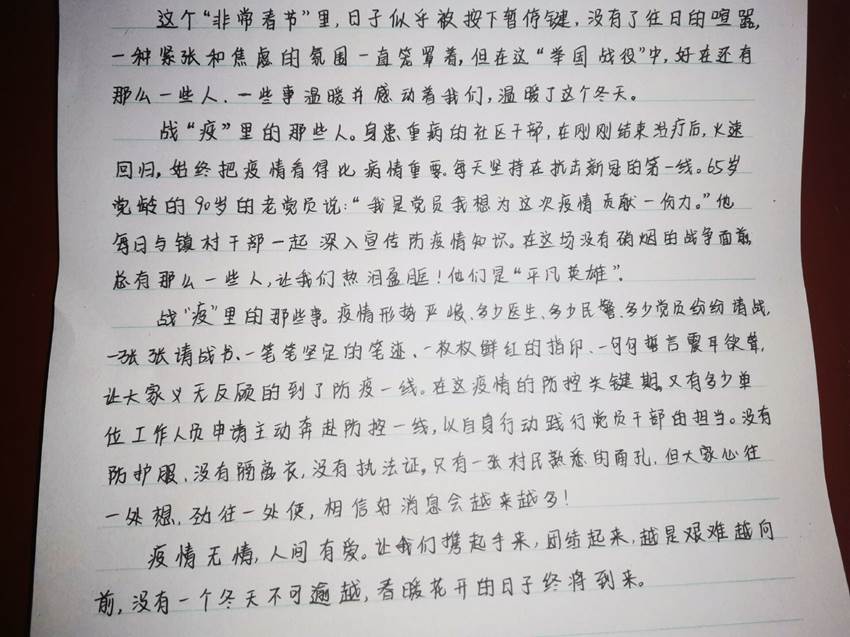同学们积极响应国家号召,在做好居家隔离的同时认真落实学校“停课不停学”的具体要求,认真开展线上专业课知识学习及雷锋月主题学习活动。为更好地传承雷锋精神,同学们在家中融情于文字,弘扬雷锋的奉献精神、抒发对英雄们在抗击疫情中大无畏精神的敬佩,表达当代大学生共同抗击疫情的决心。学院全体团学干部纷纷拿起手中的笔,化文字为斗争力量,与奋战在一线的英雄们共同抗击疫情。正如同学们文章中所说那样在此次抗击新冠肺炎的战场上,没有人是孤军奋战,惟其14亿中国同胞勇毅、同心,才能势不可挡、战无不胜。