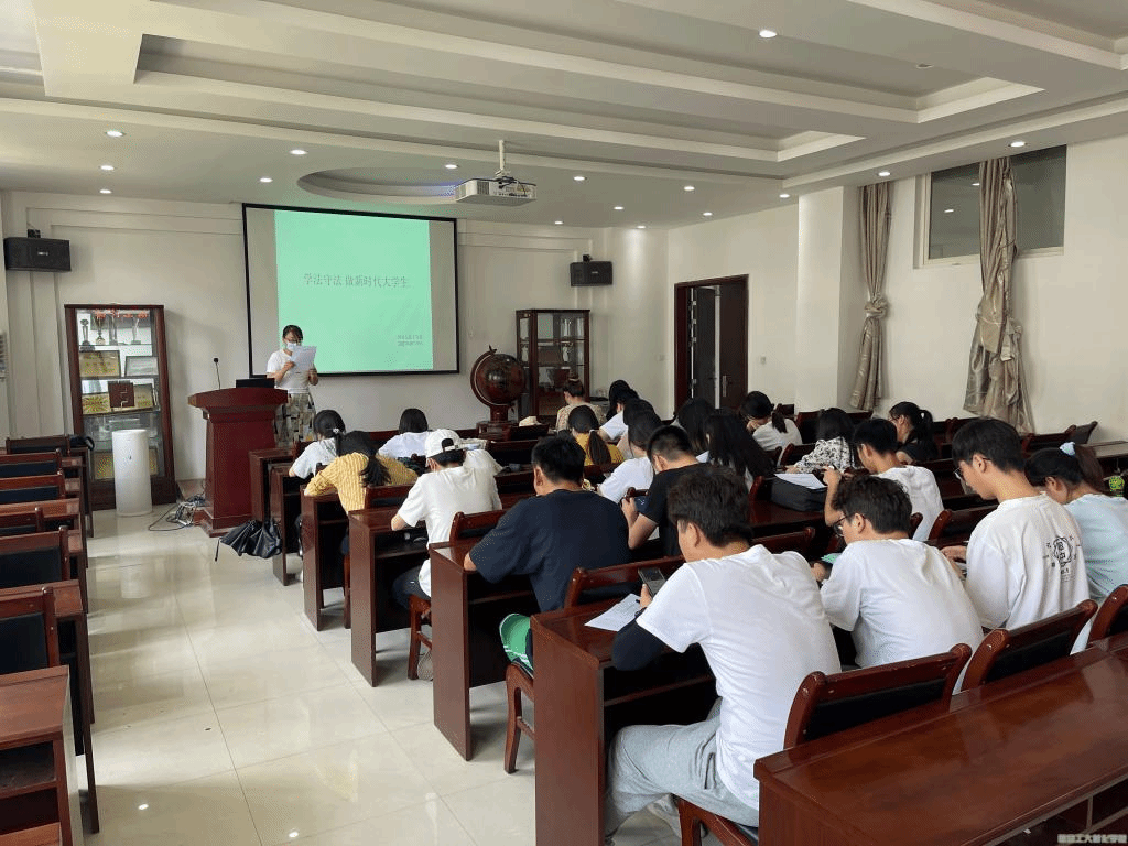 2018级学生在工3-404开展“学法守法做文明大学生”主题宣讲会。2018级辅导员张瑞红老师和2018级学生本次会议。