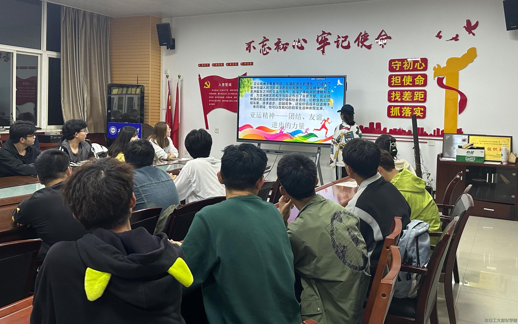 会议伊始,学生干部王思远通过一段精彩的亚运会集锦向大家详细的展示出团结、友谊和进步的亚运精神。亚运精神,是一种激励人心的力量,是体育的积极价值和社会责任。会议中全体成员通过对亚运会中国家所取得荣誉数据以及青年人再续前辈们的风采,接过强大的运动精神接力棒镜头,让在场的学生感受到什么是青年担当、运动精神、国家荣耀。此外,学生干部张桐对亚运会中出现的青年大学生志愿服务身影与参会学生进行交流探讨,并倡议全体学生会成员在今后要明确自身的责任和使命,坚持“团结、友爱、互助、进步”的志愿服务精神,为学院和学校的发展贡献自己的青春力量。会中,全体成员对志愿服务精神、国家力量、中国飞跃等热词发表了自己的观点。
