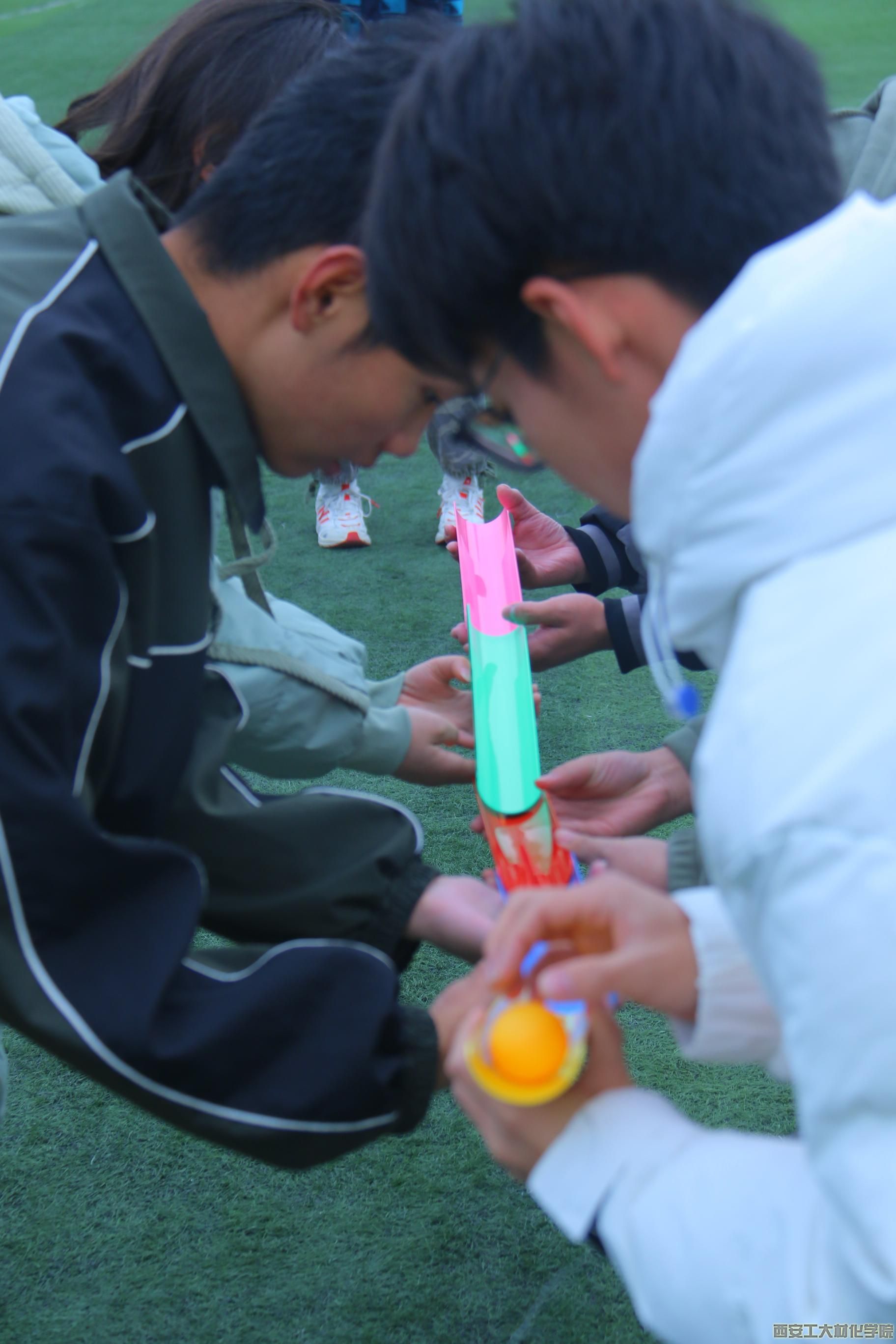 本次运动会由新生院材料类、环境工程专业每个班级出一支队伍,每队十人。在裁判员的号令下,第一支班级出发,他们势如破竹,按照自己拟定的顺序完成着田径场上的十个项目。间隔两分钟后第二支队伍也紧随出发,不甘落后,待十支队伍出发完毕后,操场上一片欢声笑语,大家在快乐中你追我赶。这些项目中有考验团队配合的“运输乒乓球”有需要技巧的“足球高尔夫”还有让大家“闻风丧胆”的“指压板跳绳”等。大家在玩的过程中增加了班级凝聚力,增强了团队协作的意识,也锻炼了身体。