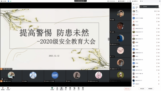 2020级安全教育主题年级大会在腾讯会议顺利开展,会议以“提高警惕,防患于未然”为主题,辅导员段强及2020级7-13、16班全体同学参加线上大会。