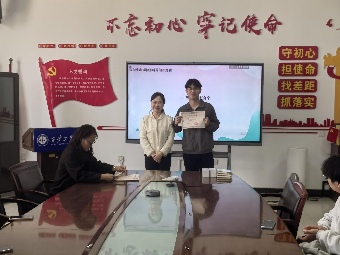 近日成功举办大学生心理健康知识竞赛。为表彰学生的杰出表现,于2025年4月3日在工3-410举行了隆重的颁奖仪式。学院党委副书记梁艳峰、心育员张瑞红以及参赛选手以及学生代表参加,共同见证这一荣誉时刻。