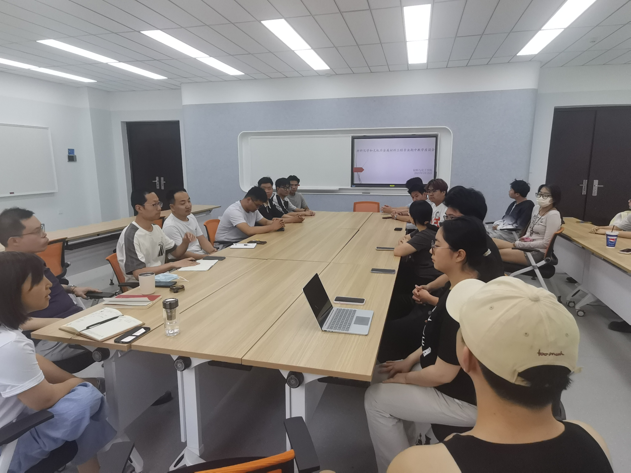 在工3-304组织召开材料化学和无机非金属材料工程专业期中教学座谈会。扈琳、赵唤琴、郭菲菲、宋岩、文瑞龙、吴杰6名教师代表,2022级辅导员张瑞红,两个专业24名学生参会,会议由材料化学教研室主任扈琳主持。