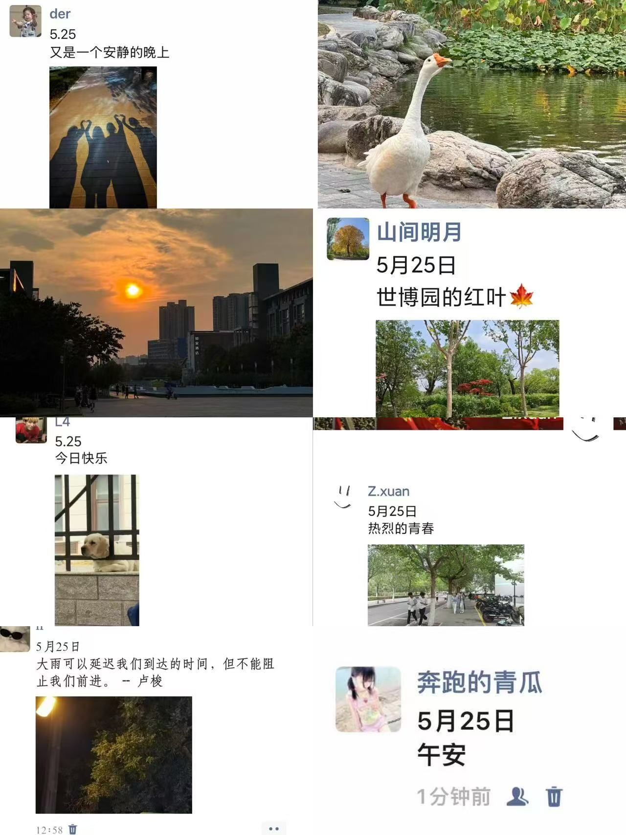 活动以“心打卡”为主题,鼓励学生每日在朋友圈发布一张记录生活美好瞬间的照片或文字,内容涵盖校园风景、学习日常、友情互动等,形式灵活且注重隐私保护。许多同学通过镜头展现了独特的视角:有的记录清晨图书馆的阳光洒在书本上的静谧,有的分享与室友共同完成实验的喜悦,还有的捕捉到校园樱花树下偶遇的温馨场景。这些瞬间不仅成为个人成长的印记,更通过社交平台形成“幸福接力”,潜移默化中缓解了学业压力,增强了心理韧性。