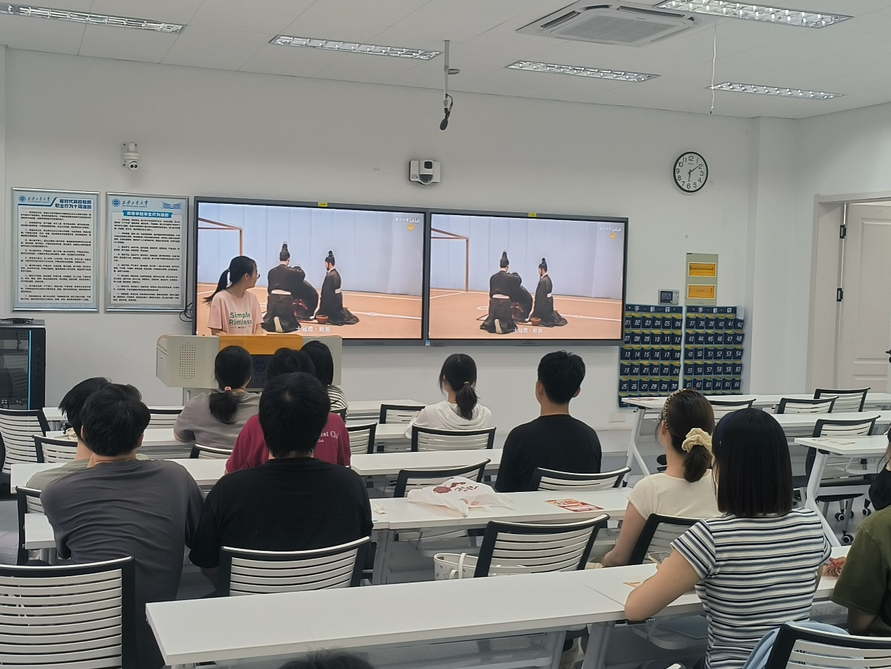 活动伊始,由团支书王思远主持并拉开序幕,她首先点明本次活动的核心目标——探寻传统礼仪在现代社会的传承与发展方向,随后引导大家从礼仪的当代定义切入,阐述礼仪作为“内外合一行为密码”的本质,以及其在快节奏社会中构建和谐秩序的必要性。随后,她依次讲解了传统礼仪“敬、和、雅”的三大精髓,深入阐释其蕴含的尊重他人、追求和谐、彰显雅致的核心要义,为大家展现了传统礼仪在修身养性、人际交往等方面的积极价值,为后续交流奠定了富有启发性的框架。最后环节,姚佳怡与韩德两位同学结合生活实例,提出可在传承传统礼仪时,保留其尊重内核,让传统礼仪在现代生活中自然延续、焕发新彩。