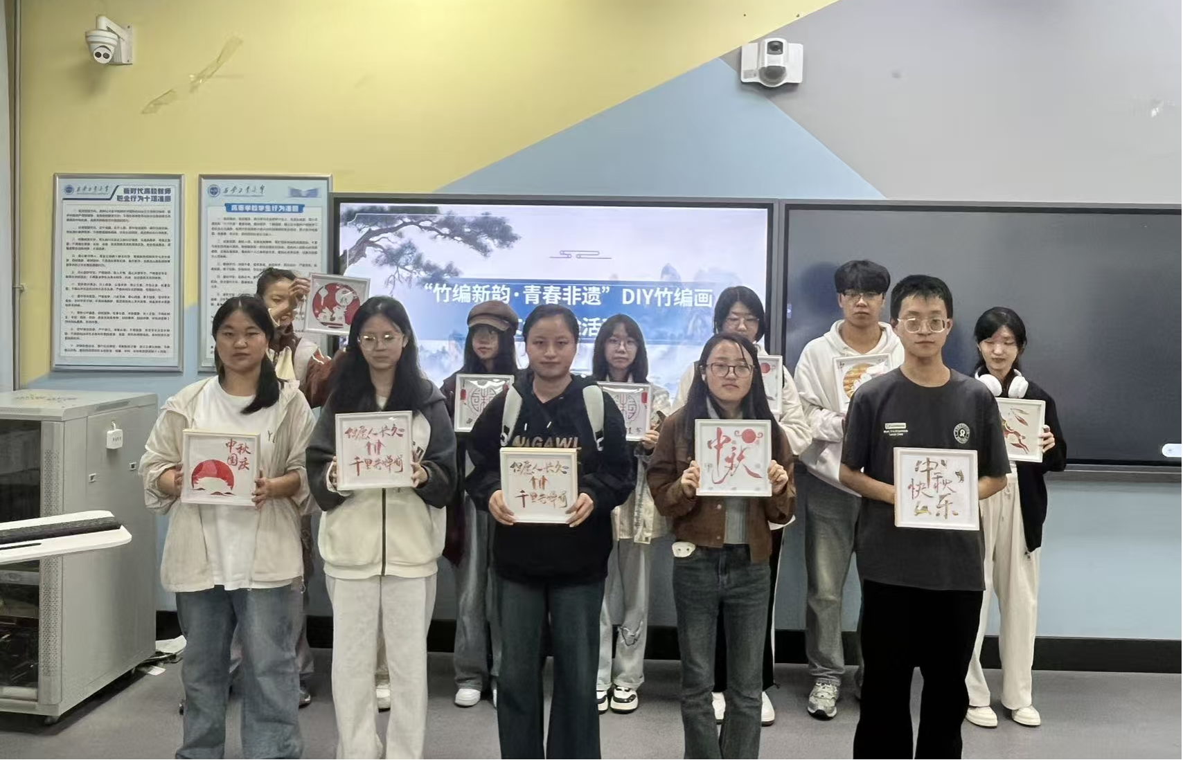 经过一个小时的精心创作,20件主题鲜明、风格各异的竹编画作品顺利完成。活动进入最后的成果展示分享环节,同学们依次手持自己的作品上台,详细介绍创作思路,分享结束后,全体同学手持竹编画作品集体合影留念,镜头定格下一张张洋溢着笑容的脸庞,也记录下此次非遗文化体验的美好瞬间。