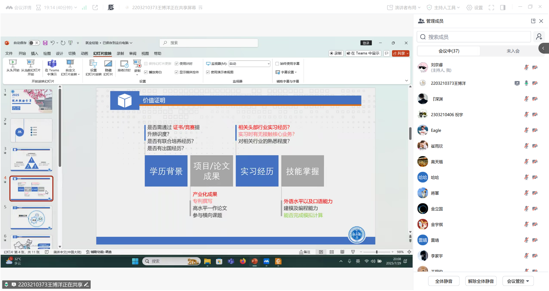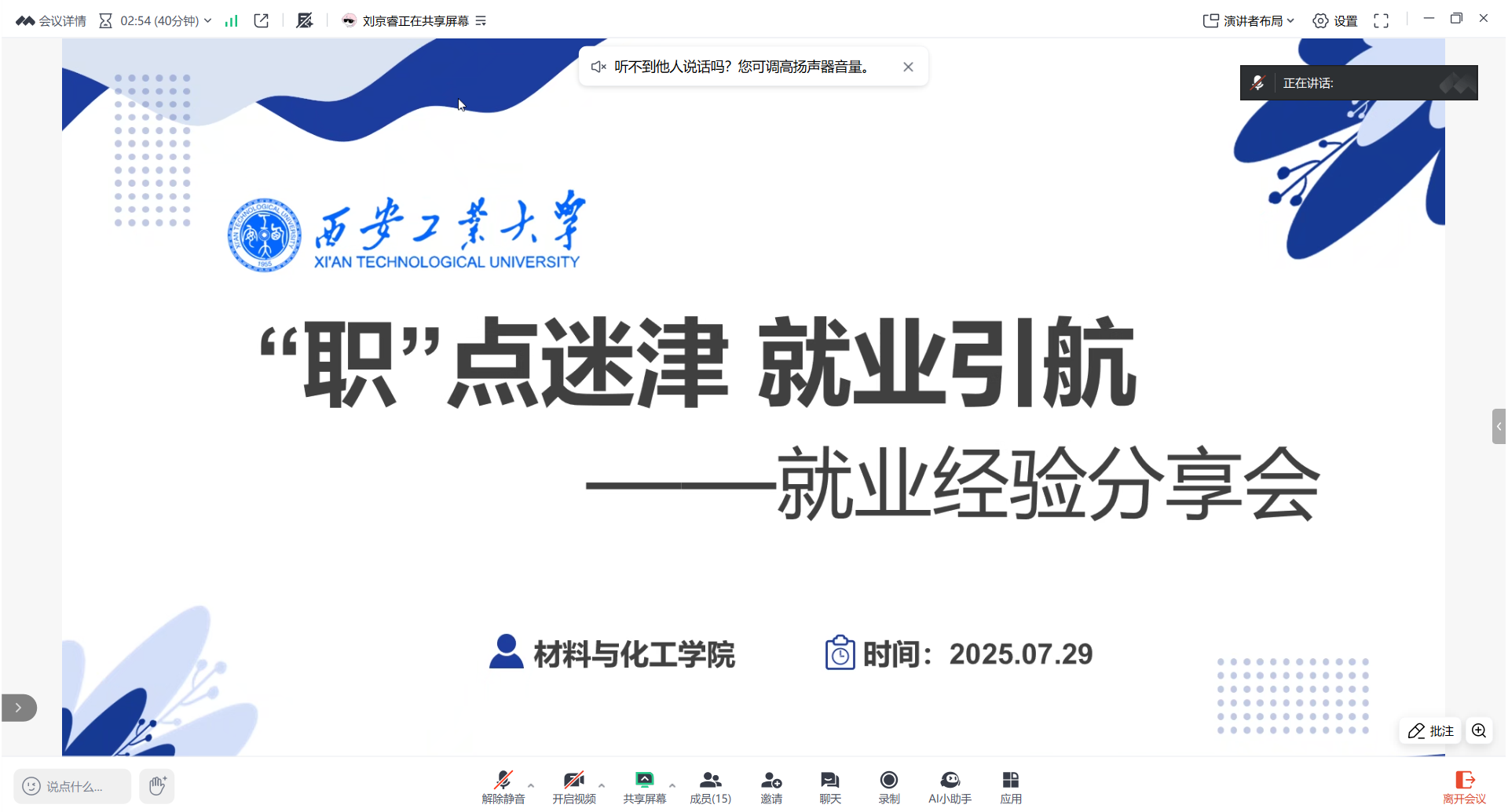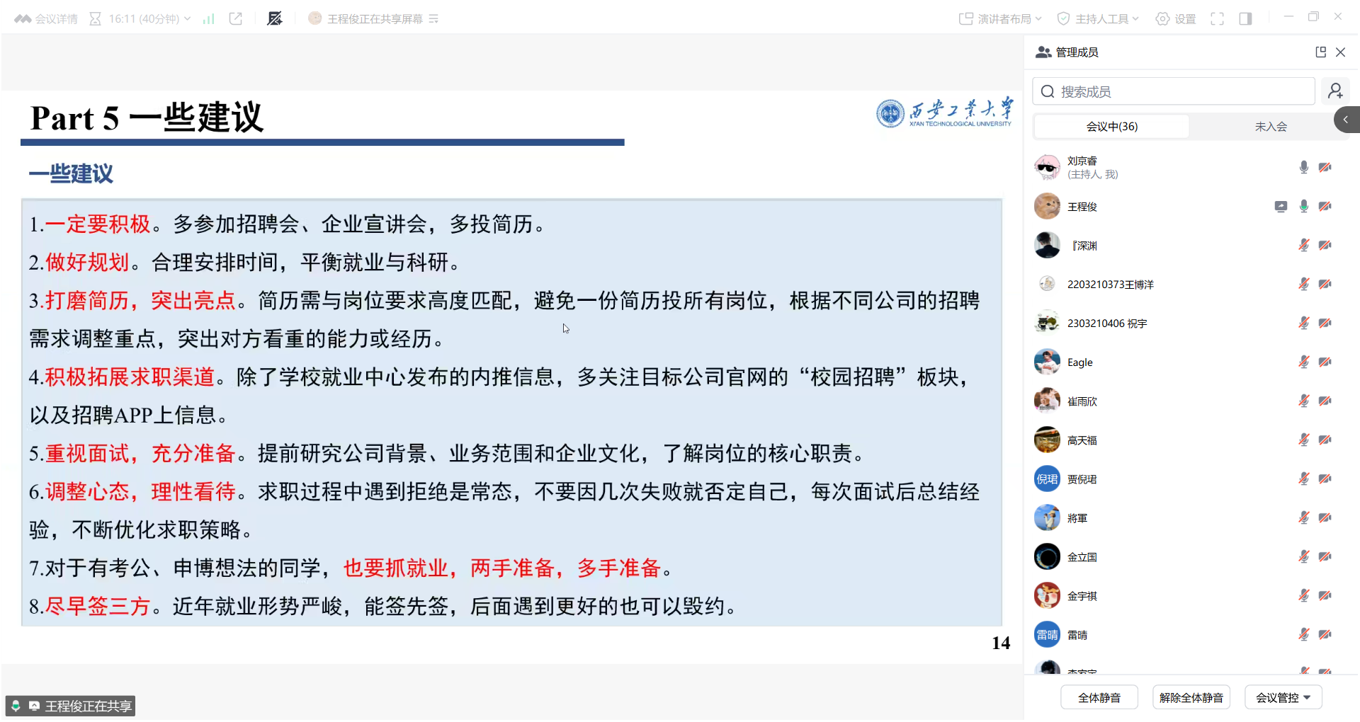 举办“‘职’点迷津”研究生就业经验线上分享会,邀请了2025届优秀毕业生王程俊和王博洋分享求职经验。学院研究生辅导员和全体研究生毕业生参加会议。