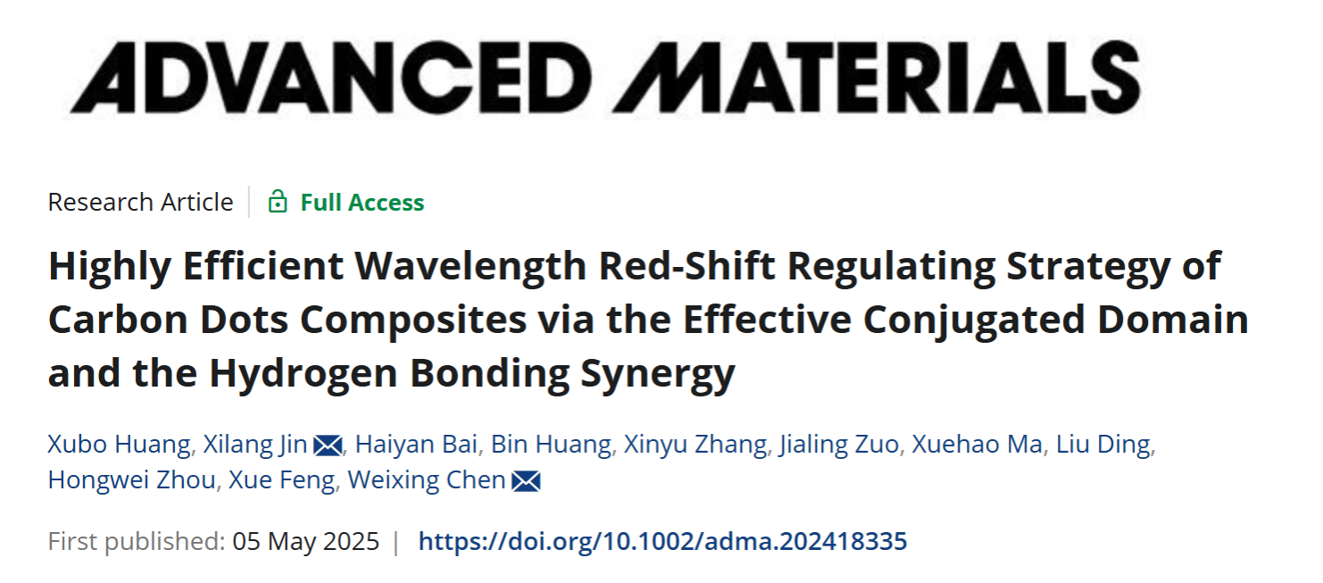 陈卫星教授、金洗郎教授带领的研究团队在国际顶级学术期刊《Advanced Materials》(IF=27.4)上发表了“Highly Efficient Wavelength Red-Shift Regulating Strategy of Carbon Dots Composites via the Effective Conjugated Domain and the Hydrogen Bonding Synergy”学术论文,陈卫星教授和金洗郎教授为论文的通讯作者,2023级博士研究生黄旭博为论文的第一作者。