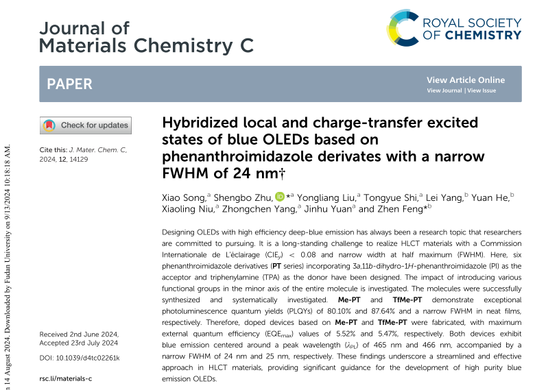 根据市场需求,本成果通过在菲并咪唑N1位置上引入不同的功能性基团,C2位置上引入强度适中的三苯胺供体,合成了一系列的具有HLCT激发态特性的荧光分子。在此基础上,通过各类测试筛选出光电综合性能优异的分子。最终应用于OLED器件上,结果表明两种掺杂器件分别实现了24 nm和25 nm的极窄半峰宽。这是在报道的HLCT器件中色纯度较高的一类。